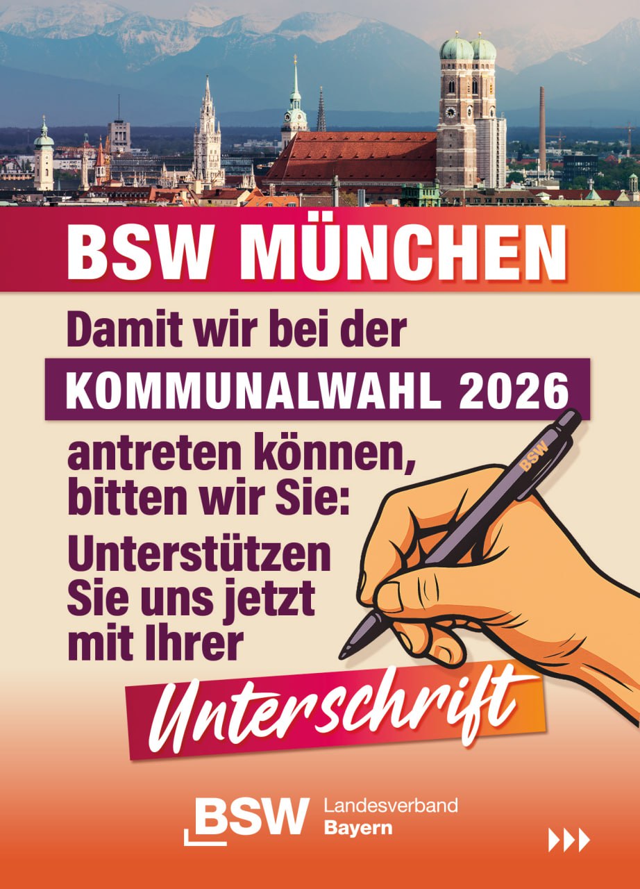 damit wir - das Bündnis Sahra Wagenknecht - als kleine Partei bei der Kommunalwahl am 8. März 2026 antreten dürfen, benötigen wir Unterstützer-Unterschriften von Münchner Bürgern.